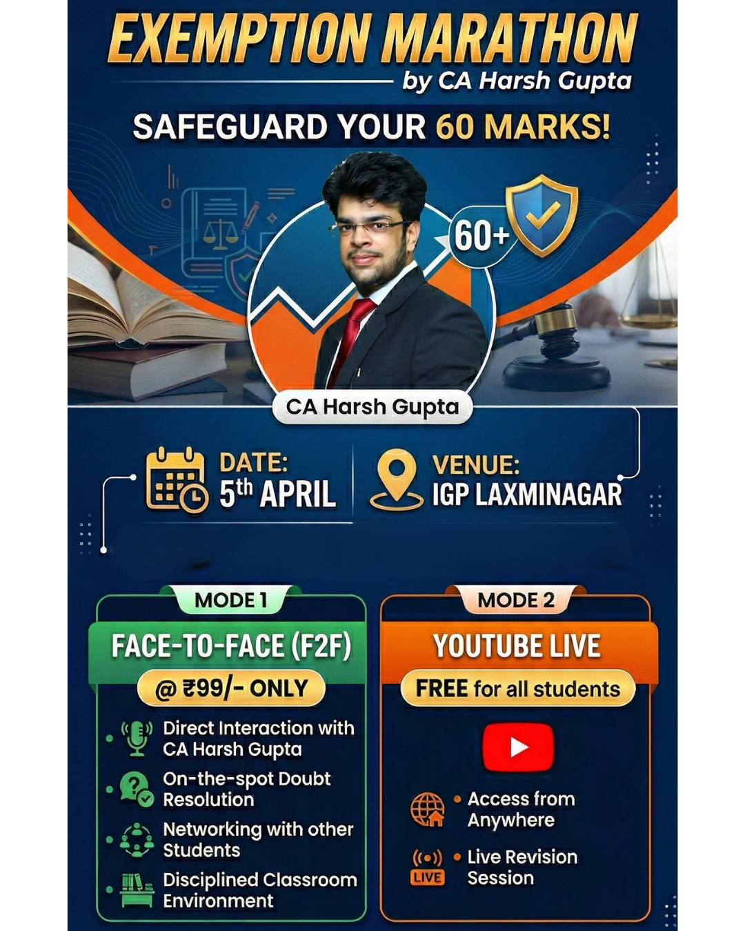 The final step to an Exemption (60+ marks) starts here. We are thrilled to announce the Exemption Marathon, a high-intensity, comprehensive revision session led by the renowned CA Harsh Gupta (4x Ranker).